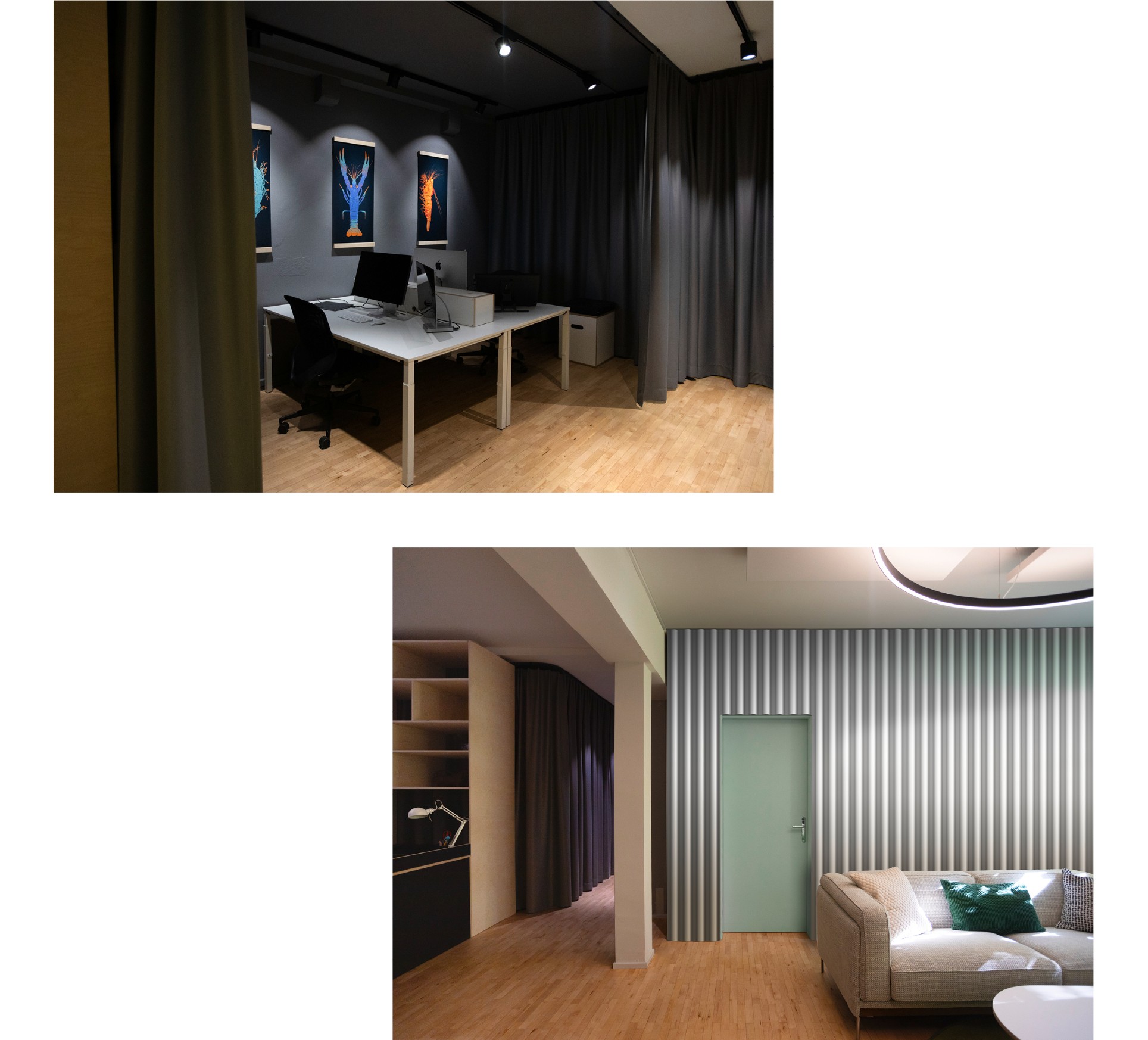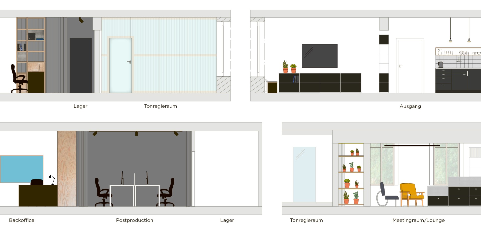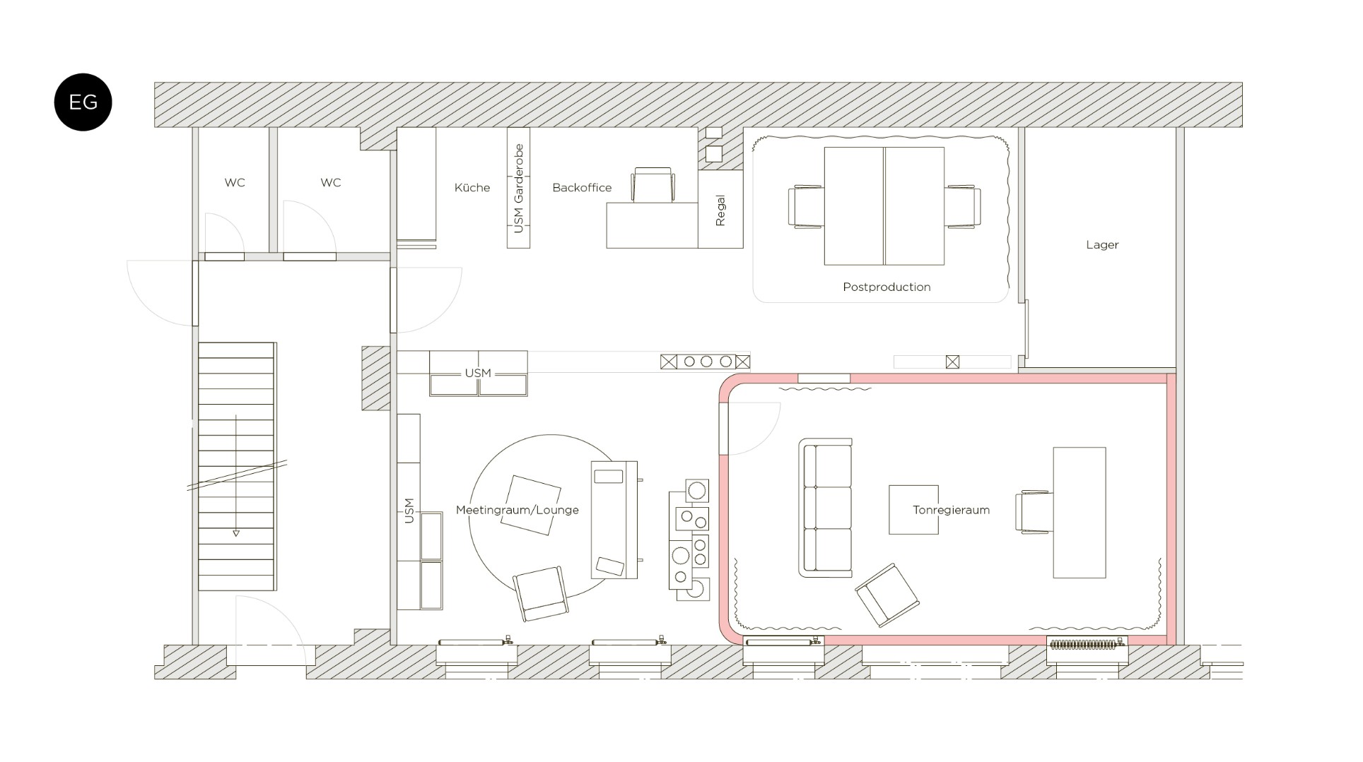 Im Erdgeschoss entstand ein Raum-im-Raum-Konzept mit neuem Tonregieraum, ergänzt durch Bereiche für Postproduction, Color-Grading und Backoffice sowie eine einladende Lounge für Kund:innen und das ganze Team.