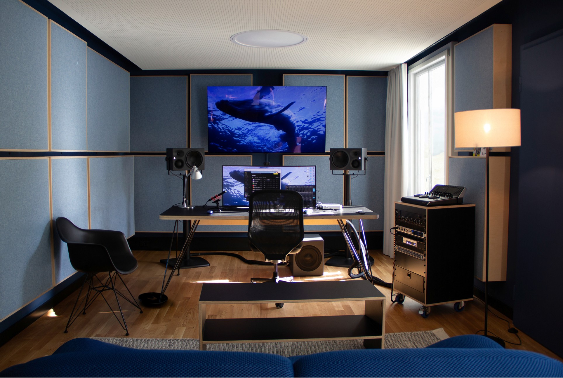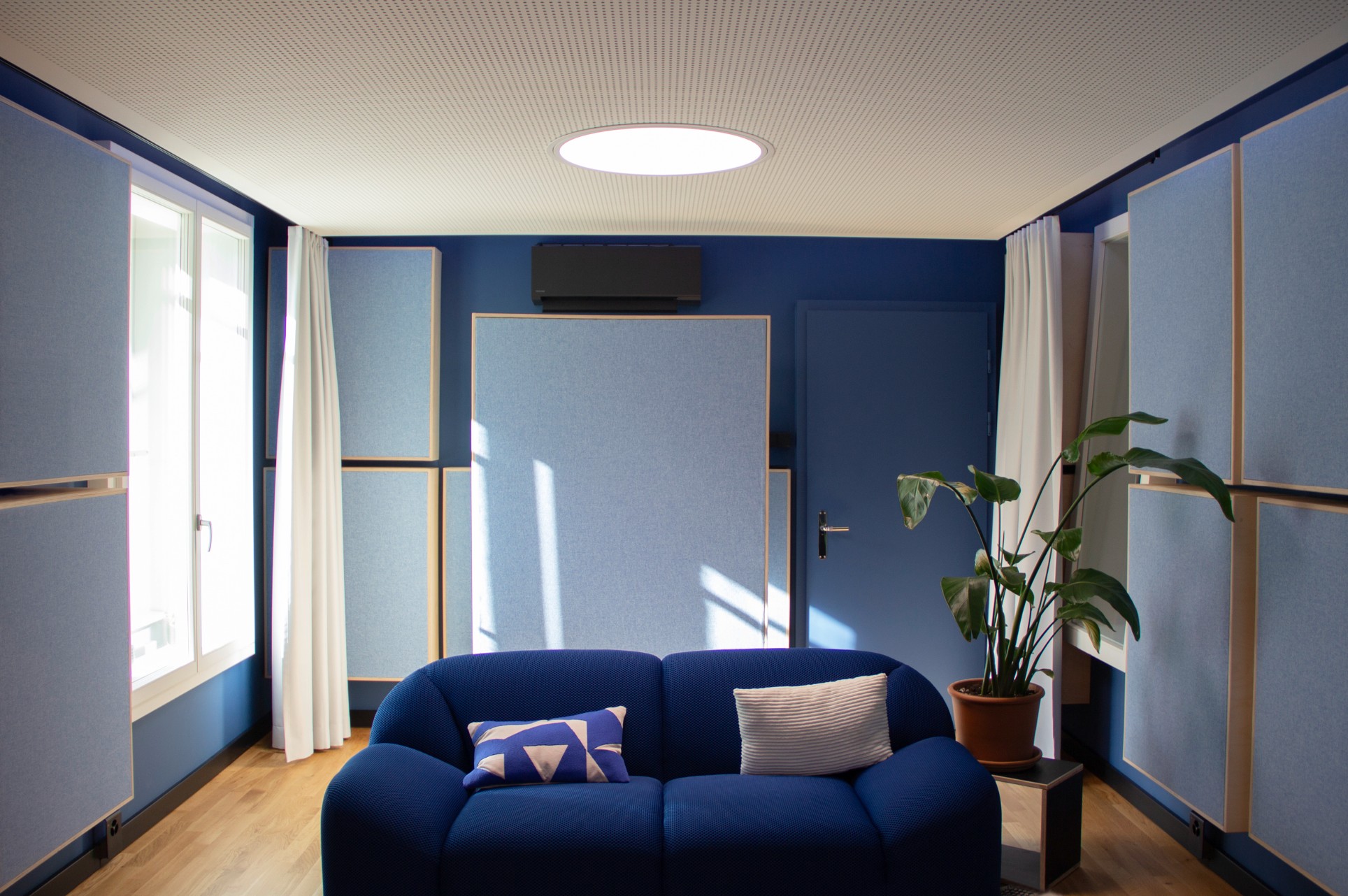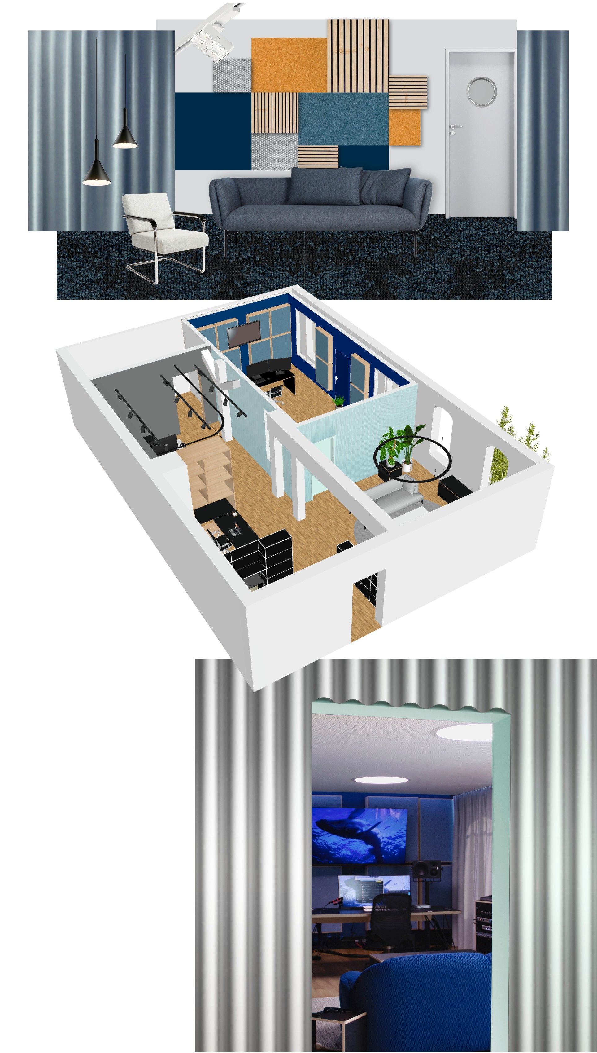 Im Erdgeschoss entstand ein Raum-im-Raum-Konzept mit neuem Tonregieraum, ergänzt durch Bereiche für Postproduction, Color-Grading und Backoffice sowie eine einladende Lounge für Kund:innen und das ganze Team.