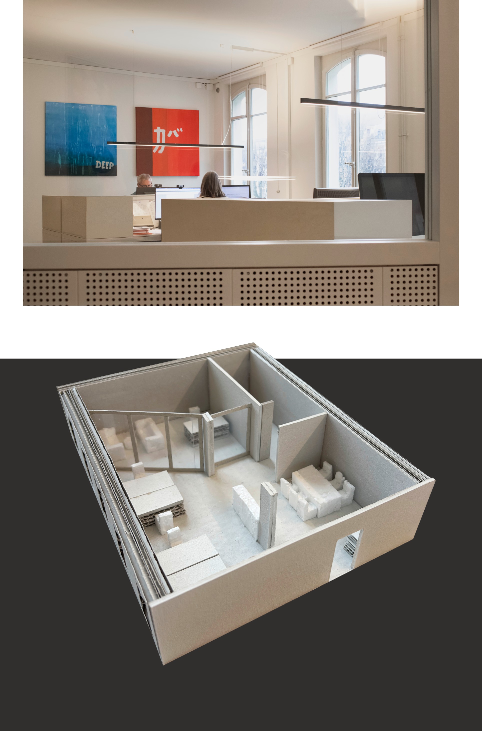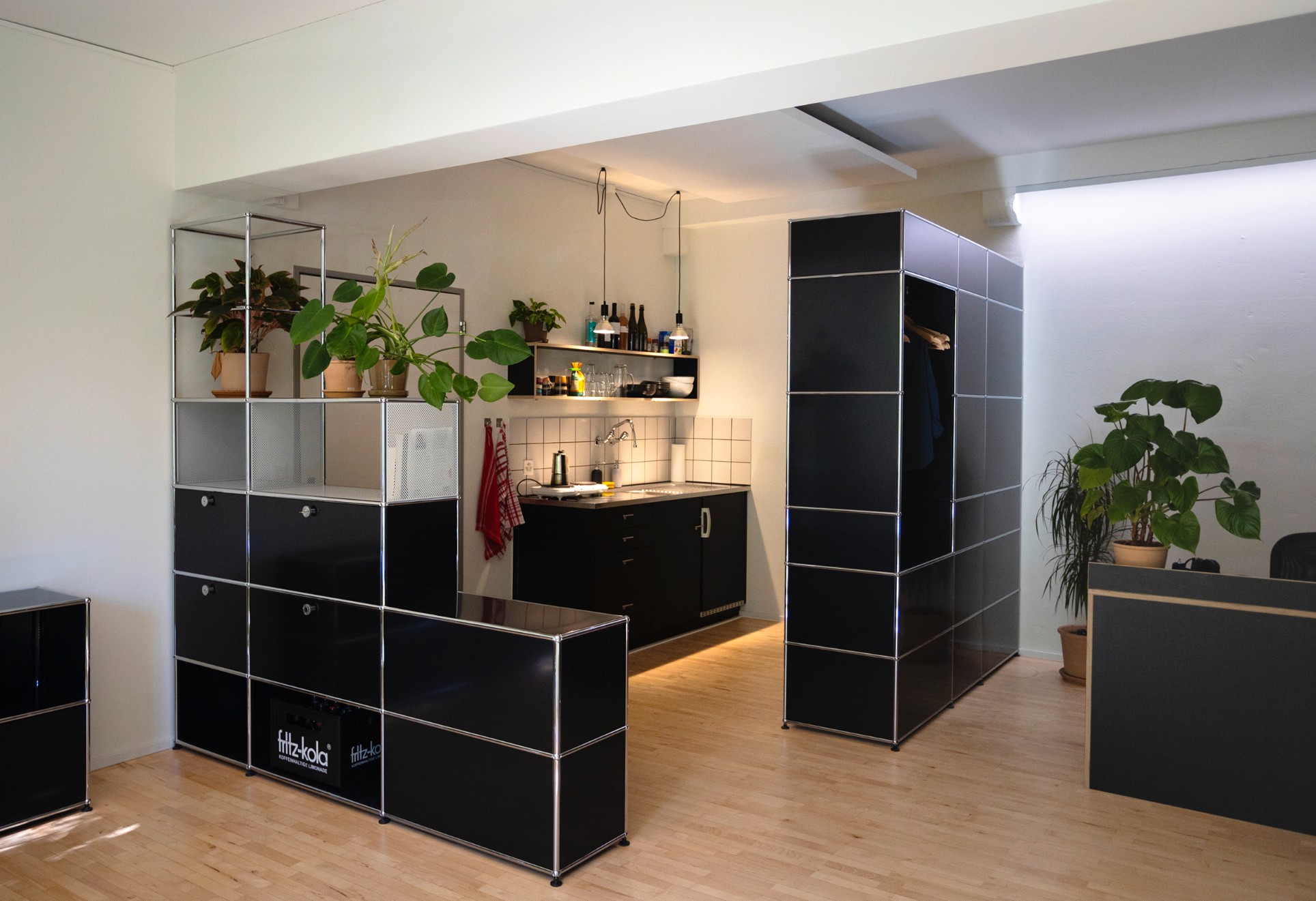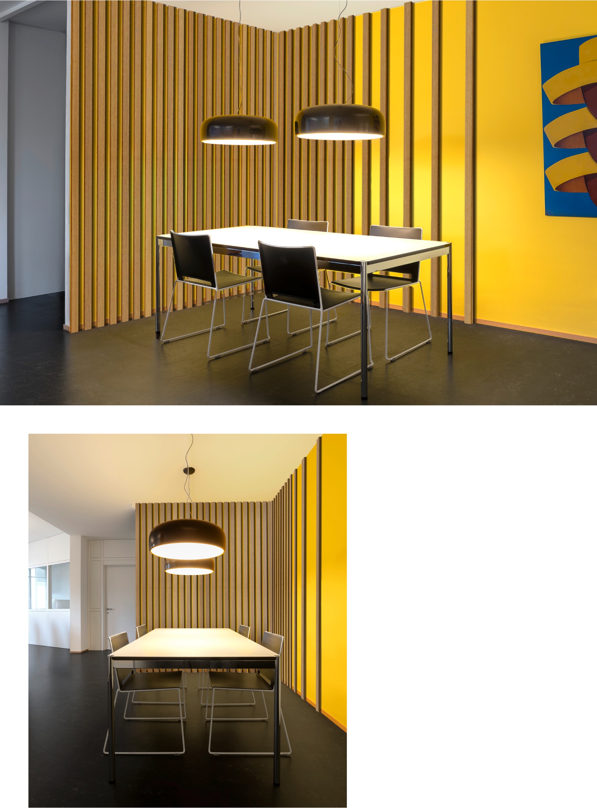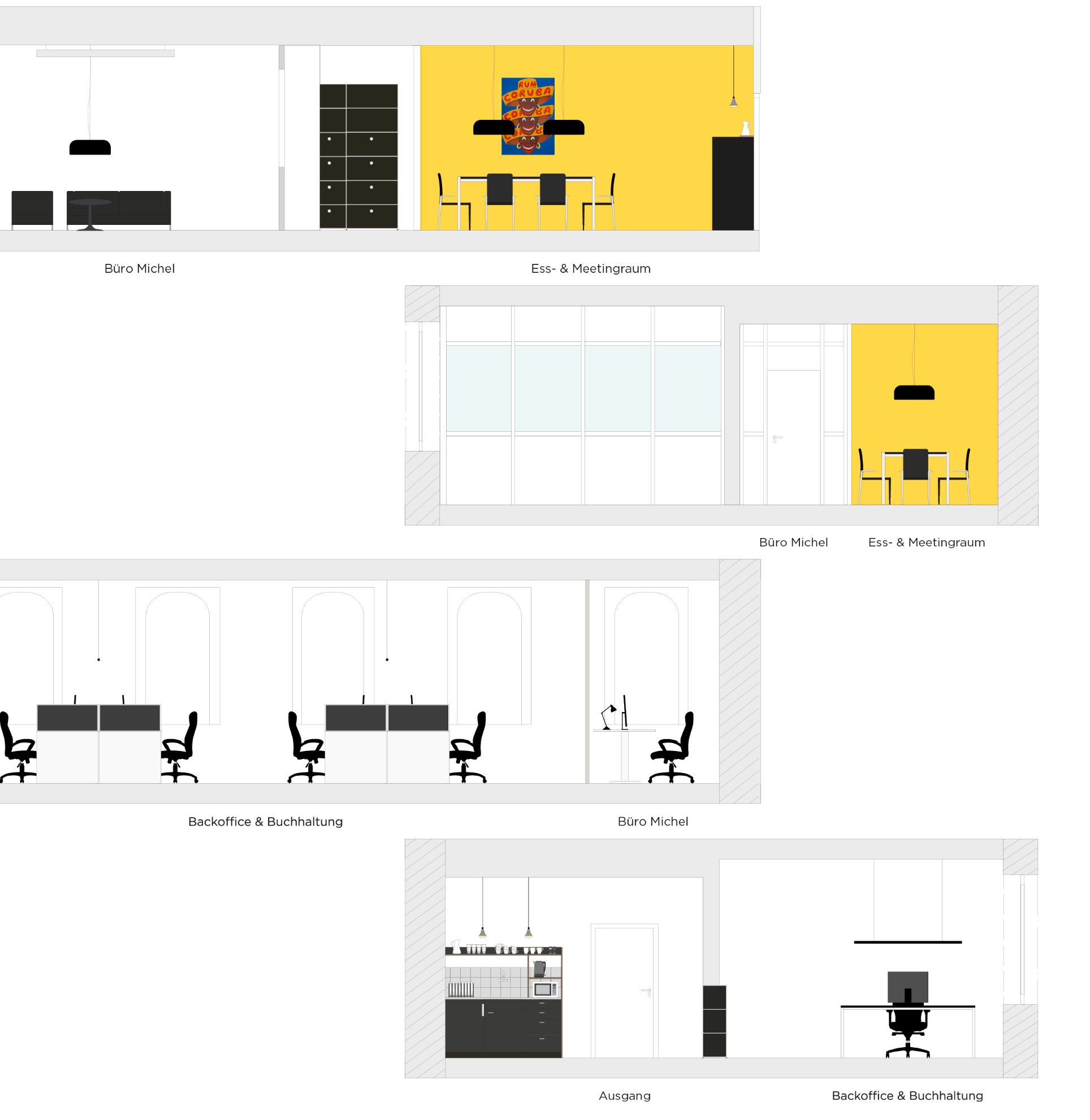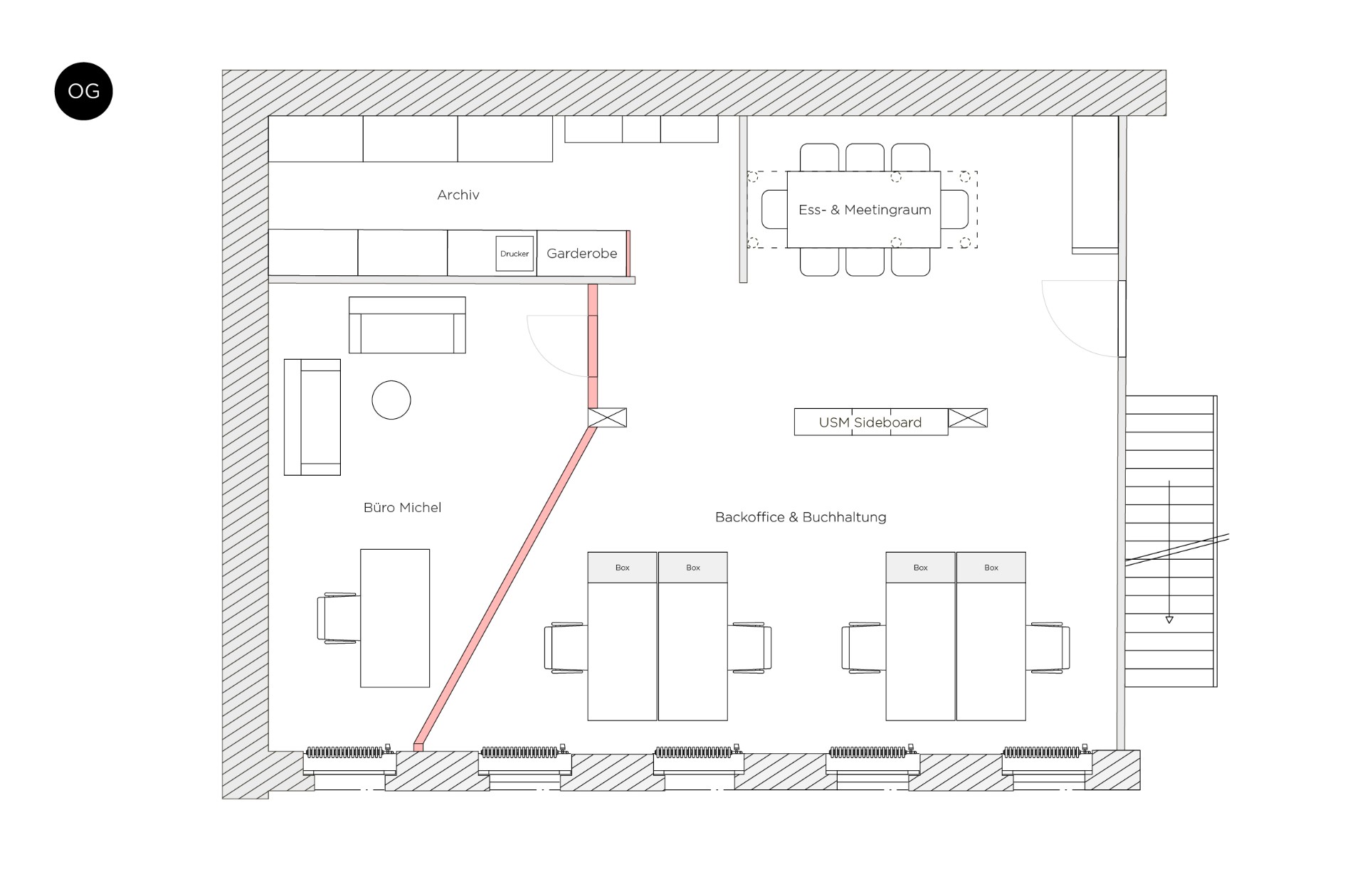 Im Obergeschoss haben wir einen offenen Lunch- und Sitzungsbereich geschaffen, Ordnung in Stauraum und Arbeitsplätze gebracht und Platz für Drucker und Garderobe definiert. Für ein Einzelbüro wurde zudem eine akustische Lösung mit neuer Trennwand in Zusammenarbeit mit kustermartin & co. umgesetzt.